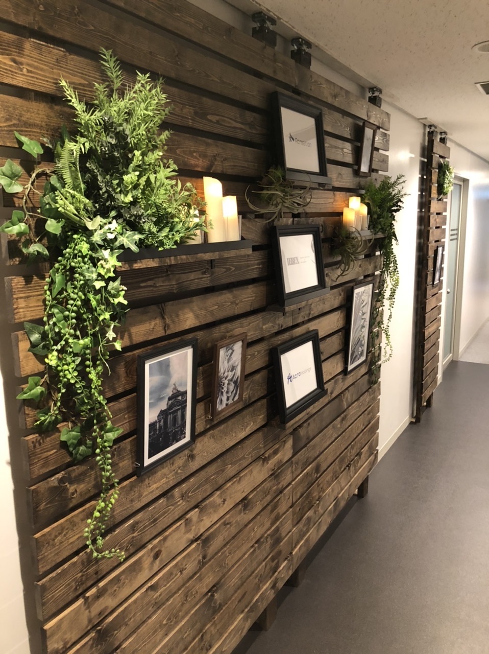木材の色に植物を合わせることで、エレベーターホールを忘れてしまうような