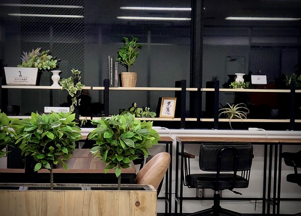 全体的に色は抑え気味に植物をふんだんに使用しソファで仕事で出来るように高さ調整も